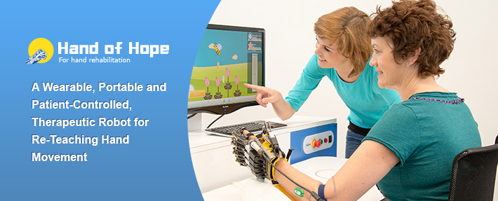 Hand of Hope is a therapeutic device that may help patients regain hand mobility through motor relearning. It facilitates muscle re-education by both amplifying and rewarding a patient with desired motion in concert with his or her own muscle signal. The system continuously monitors and senses, but does not stimulate, the affected muscles.